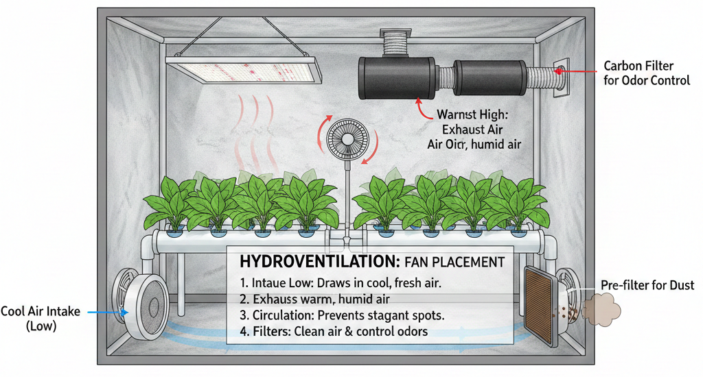 To maximize the efficiency of your ventilation system, you must work with physics. Hot air naturally rises, while cool air stays low. A strategic layout ensures that “old” air is removed and “new” air reaches every leaf.