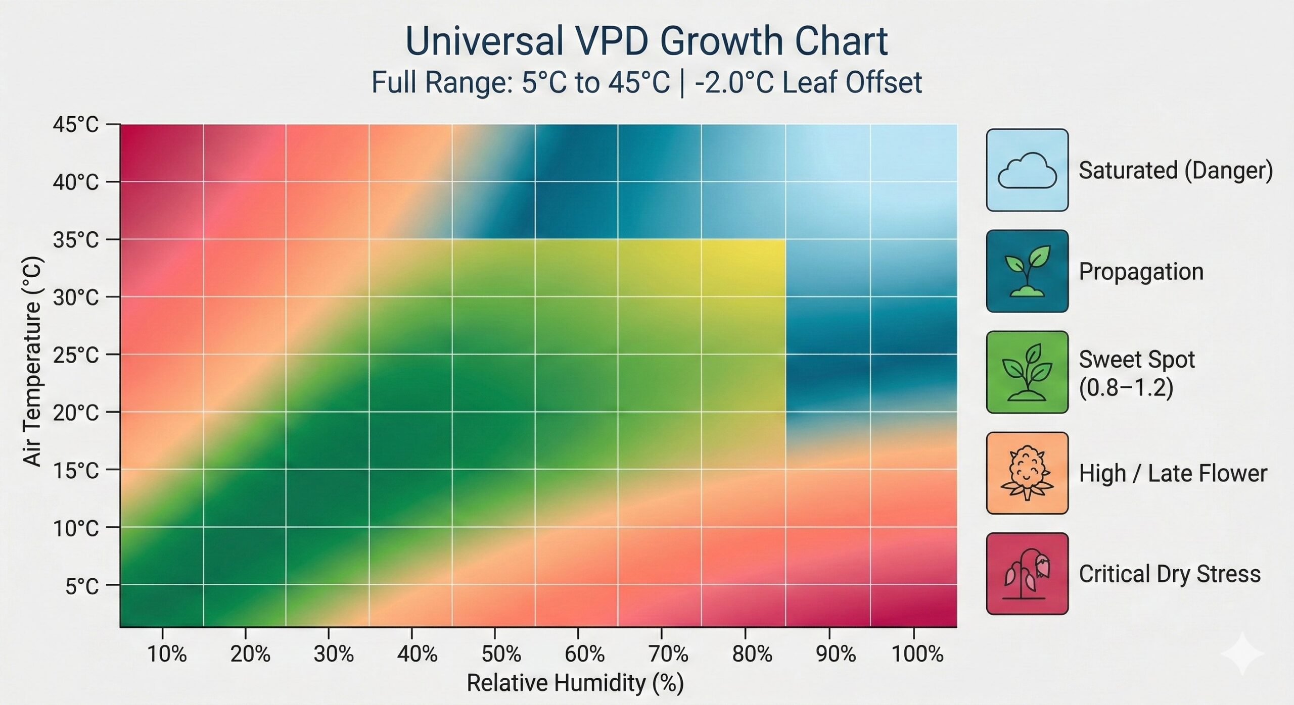 As temperatures rise, notice how you must aggressively increase humidity to stay within the healthy green “Sweet Spot.”